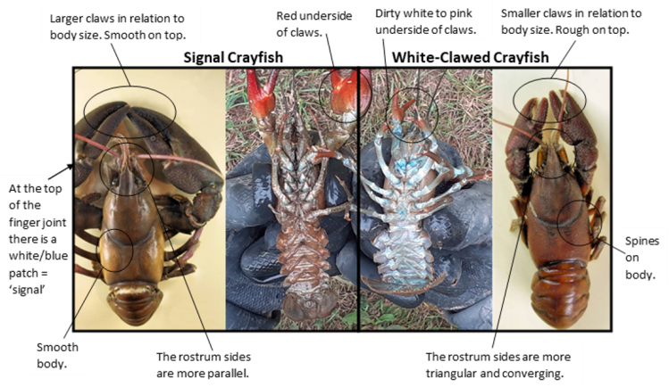 So now we know the crayfish is an ‘omnivorous scavenger’, what do they look like? Well here is a comparison between our native crayfish (good) versus an American signal crayfish (bad) pinched from Malvern Hills Crayfish Group (hope they don’t mind?)