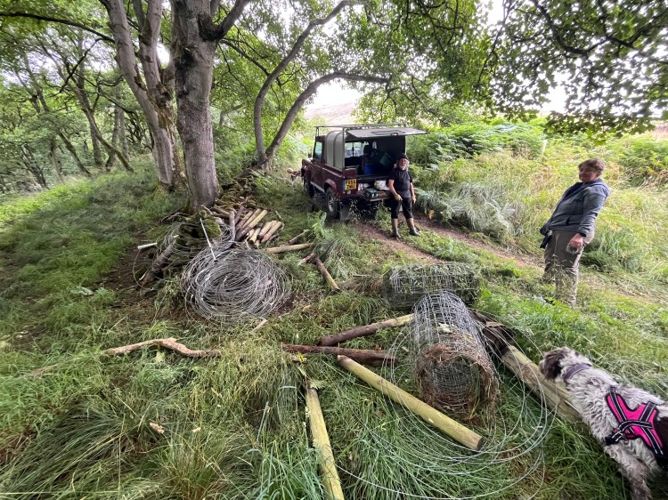The wire netting we remove will be reused elsewhere to protect natural regeneration/planting spots from errant sheep and the posts will either be reused if good enough or cut and used for fuel.